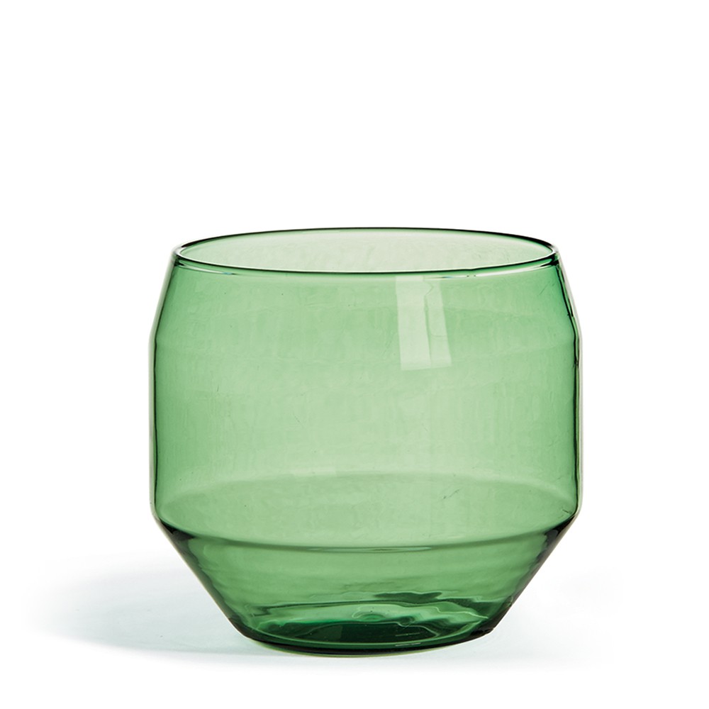 La leggerezza del vetro borosilicato si presta a nuove trasparenze. Dal soffio tradizionale a goccia del mastro vetraio, prendono forma insolite geometrie. Indagando le altre possibilità espressive di questo materiale, che grazie ad una serie di angoli, viene invitato ad allargarsi, a restringersi e poi a chiudersi per disegnare un vuoto da poter appoggiare, nascono le caraffe e i bicchieri della collezione Angolo, in vetro trasparente o verde. Un ampio tappo in ottone spazzolato permette di conservare e perciò mantenere il prezioso contenuto sia esso acqua o vino.