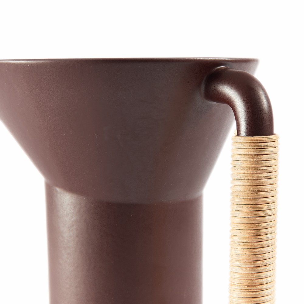 Il manico della brocca è accentato con un intreccio in rattan che conferisce al pezzo, laddove entra in contatto con il calore della mano umana, una forte sensazione tattile.