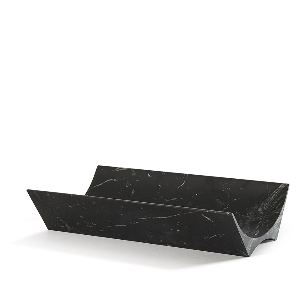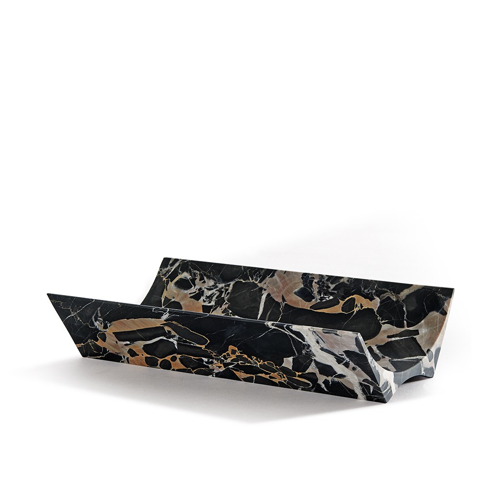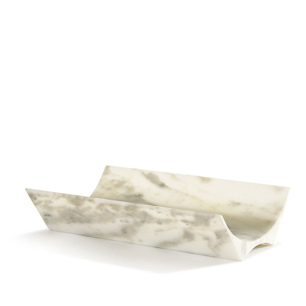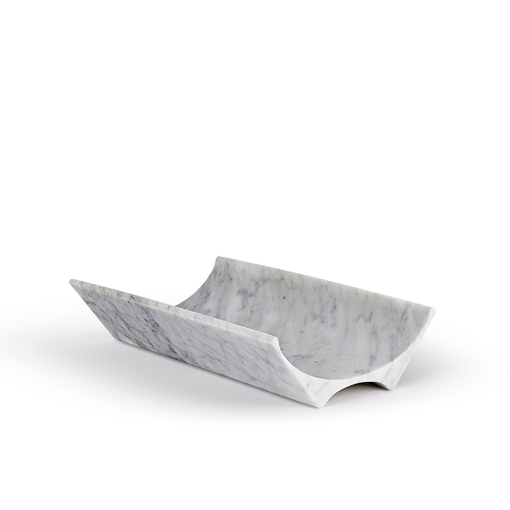 Un’arca leggiadra, solida al contempo, maestosa al centro della tavola, la venatura del marmo più pregiato come monumento alle piccole cose che rendono bella la vita. Un frutto, il pane, gli oggetti più cari. Ecco il contenitore in marmo per l’abitare quotidiano: un oggetto-scultura che eredita forme archetipiche del mondo classico, tanto care ai maestri del design (Enzo Mari in primis). Lo sapevano i grandi scultori che ogni pezzo di marmo viene estratto dal cuore della terra con una venatura sua propria. Così, questo centrotavola, portaoggetti, fruttiera, ha una grana, dei riflessi e delle cromie sempre diverse che rendono ogni pezzo un unicum.