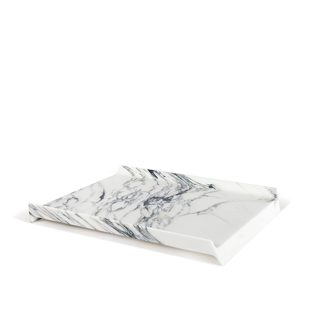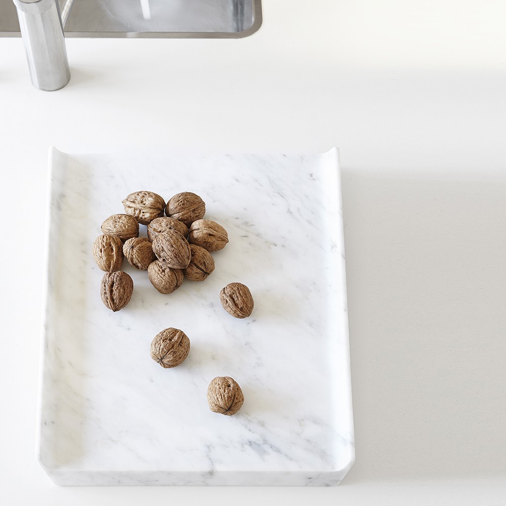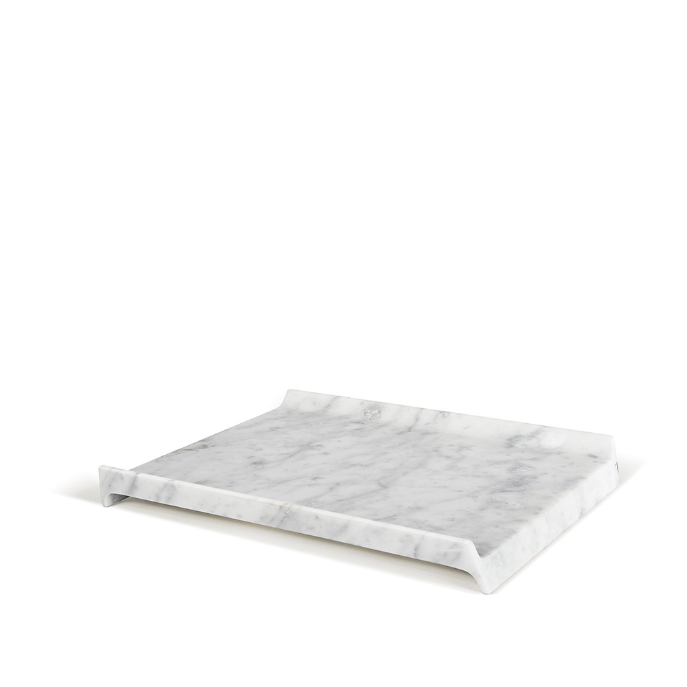 Bianca e compatta come la neve questa Slitta sfila sul tavolo. Un vassoio liscio, perfetto, iconico, un oggetto-scultura che eredita forme archetipiche del mondo classico, tanto care ai maestri del design (Enzo Mari in primis). Una liscia scultura che si dispone a ospitare cose buone da offrire, mettendole in risalto con le sue venature uniche, proprie del pezzo di marmo in cui viene tagliato. Così, questo accessorio nobile del mangiare quotidiano, ha una grana, dei riflessi e delle cromie sempre diverse che rendono ogni pezzo un unicum.