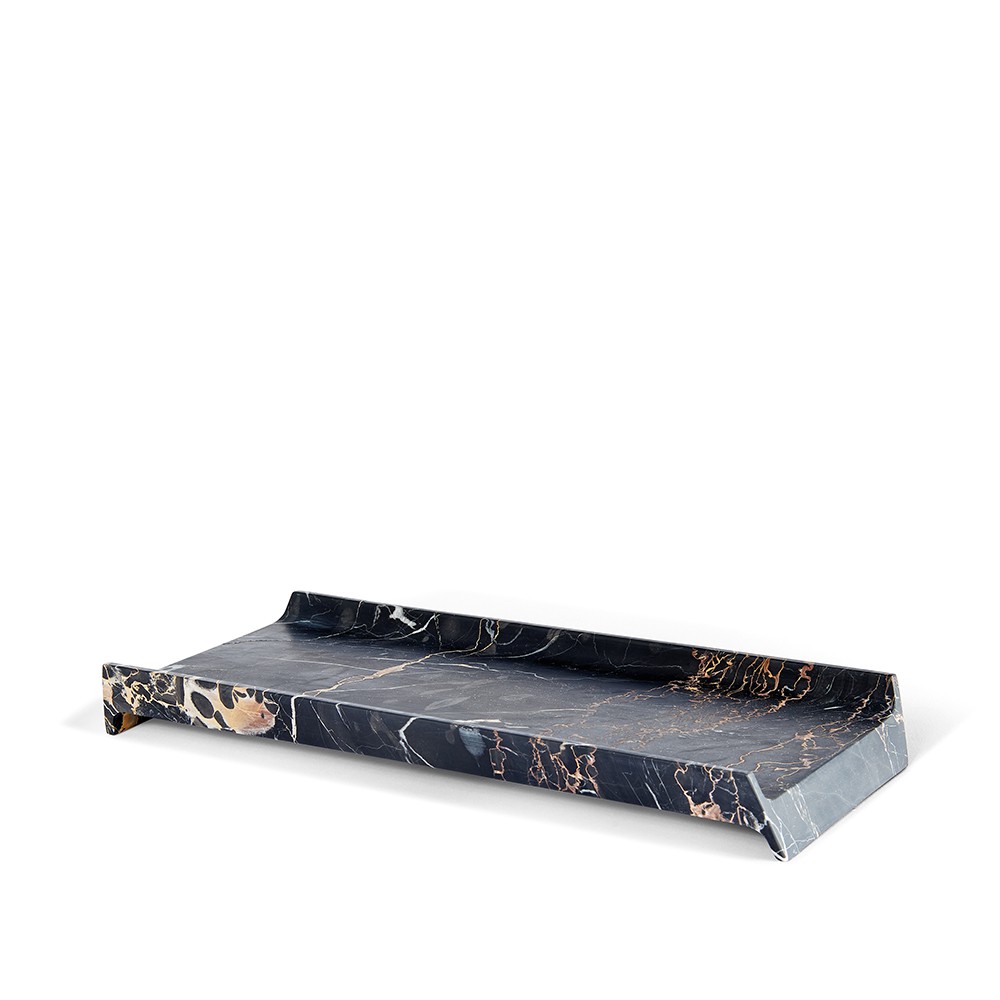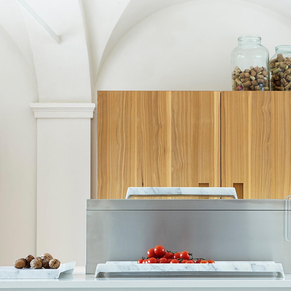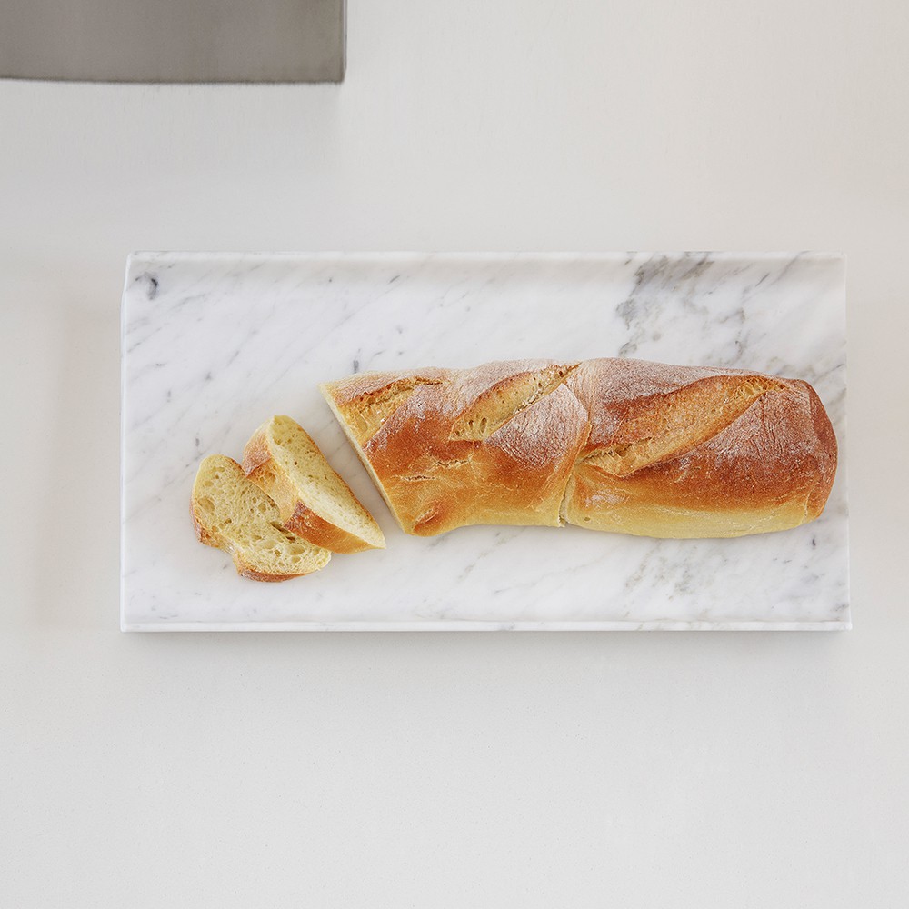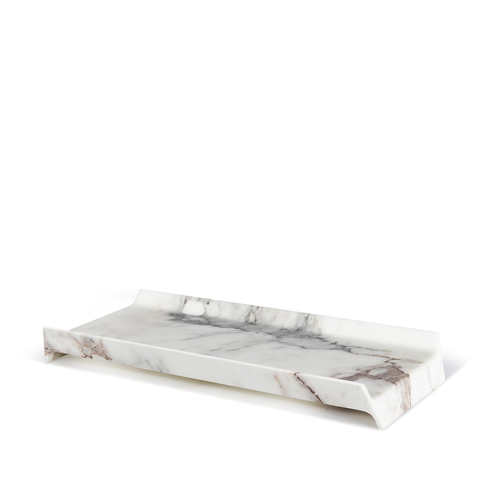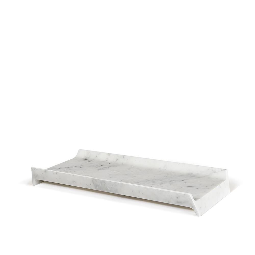Bianca e compatta come la neve questa Slitta sfila sul tavolo. Un vassoio liscio, perfetto, iconico, un oggetto-scultura che eredita forme archetipiche del mondo classico, tanto care ai maestri del design (Enzo Mari in primis). Una liscia scultura che si dispone a ospitare cose buone da offrire, mettendole in risalto con le sue venature uniche, proprie del pezzo di marmo in cui viene tagliato. Così, questo accessorio nobile del mangiare quotidiano, ha una grana, dei riflessi e delle cromie sempre diverse che rendono ogni pezzo un unicum.