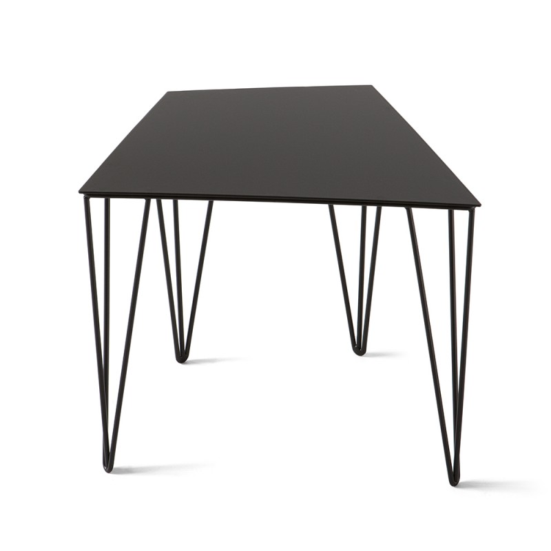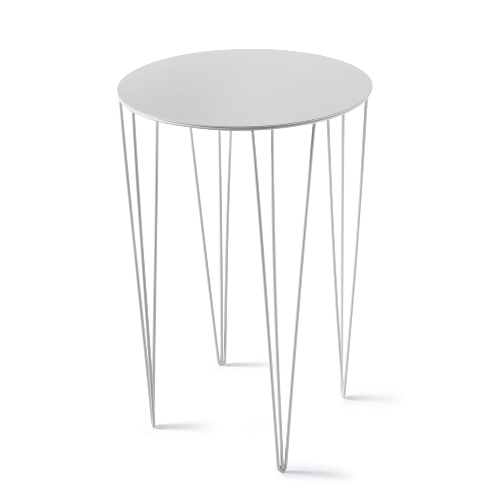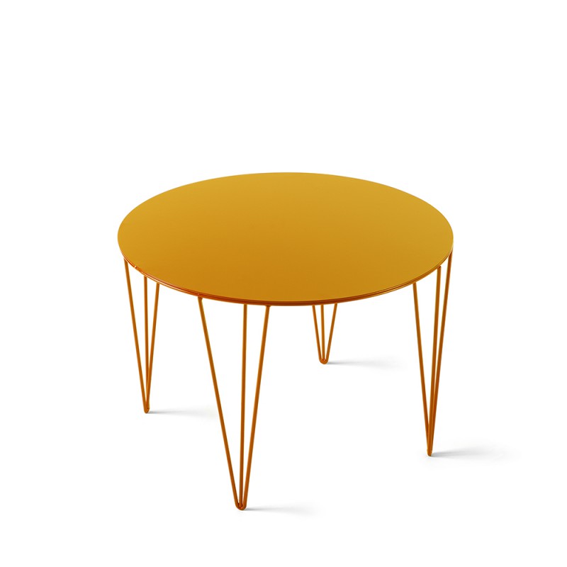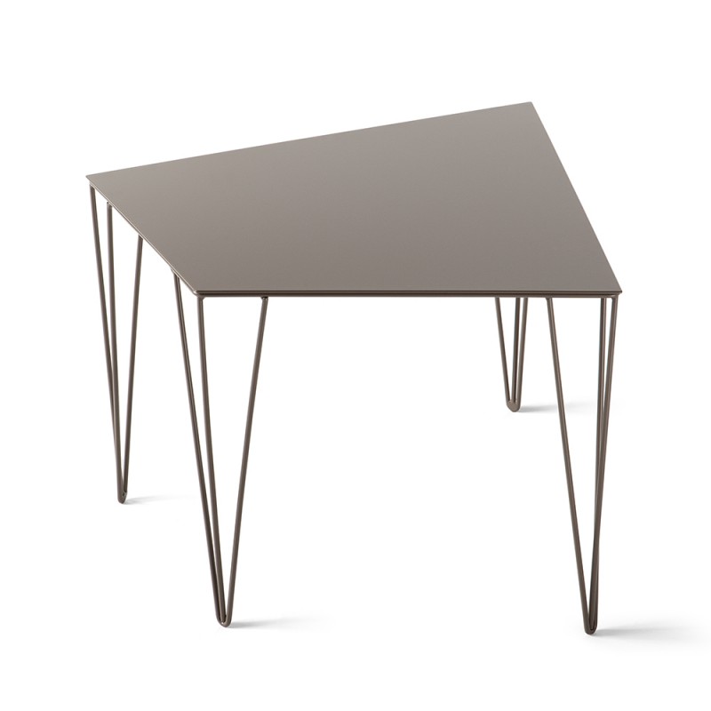 Il piano, tondo o trapezoidale, poggia su gambe in tondino di ferro disposte a triangolo, che danno un ulteriore senso di dinamicità e leggerezza a tavolini dal profilo già minimale.