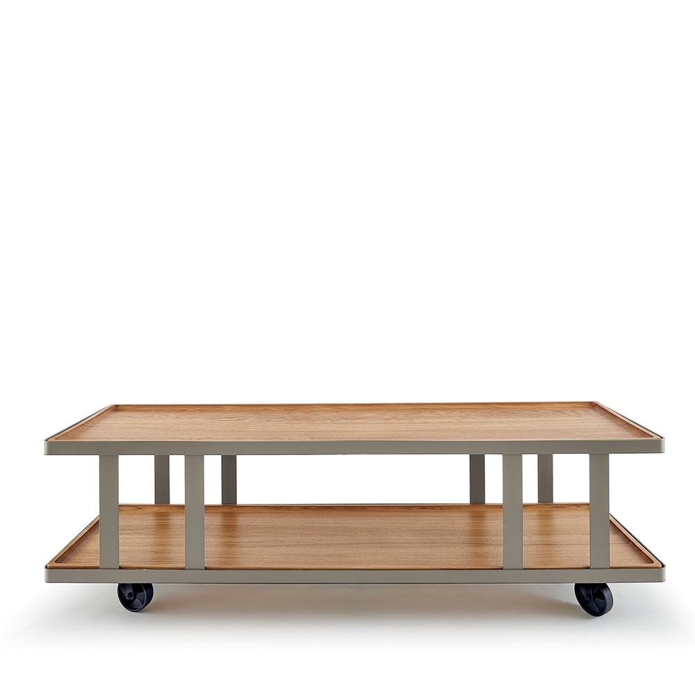 Recinti lineari per vassoi mobili. La collezione Hutch per Atipico è un sistema dove il vassoio è il protagonista. In forma di disco o di asse rettangolare in frassino e rovere massello, sagomati sui bordi, i piani/vassoi Hutch ‘calzano’ su strutture metalliche verniciate, che li incastonano, li reggono.