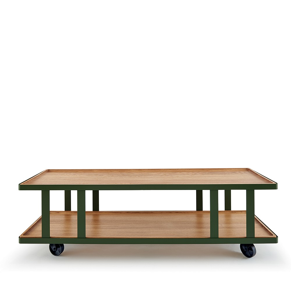 Recinti lineari per vassoi mobili. La collezione Hutch per Atipico è un sistema dove il vassoio è il protagonista. In forma di disco o di asse rettangolare in frassino e rovere massello, sagomati sui bordi, i piani/vassoi Hutch ‘calzano’ su strutture metalliche verniciate, che li incastonano, li reggono.