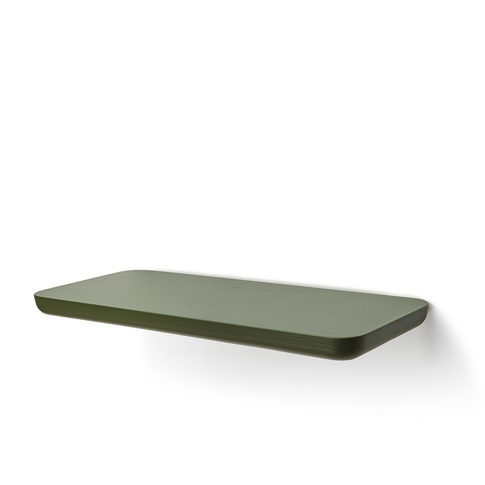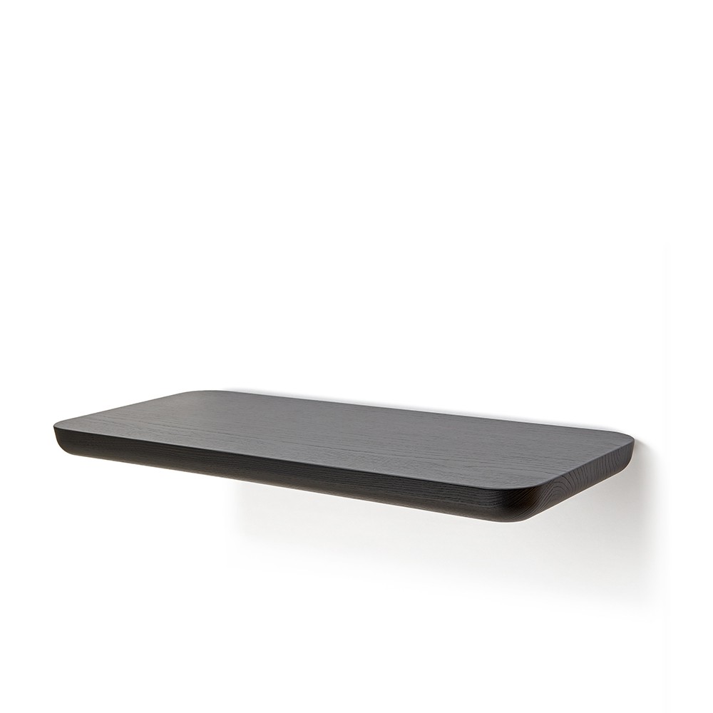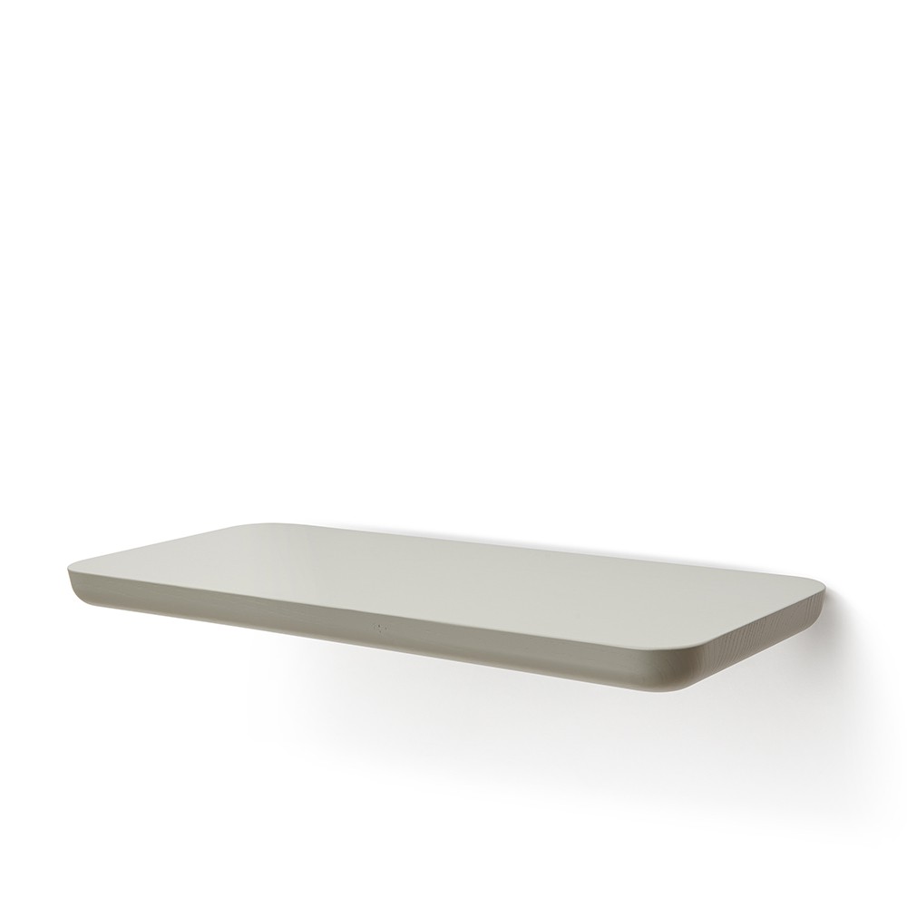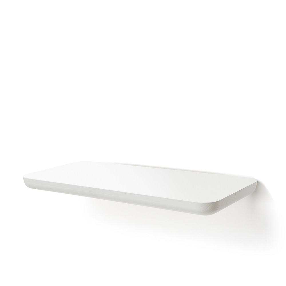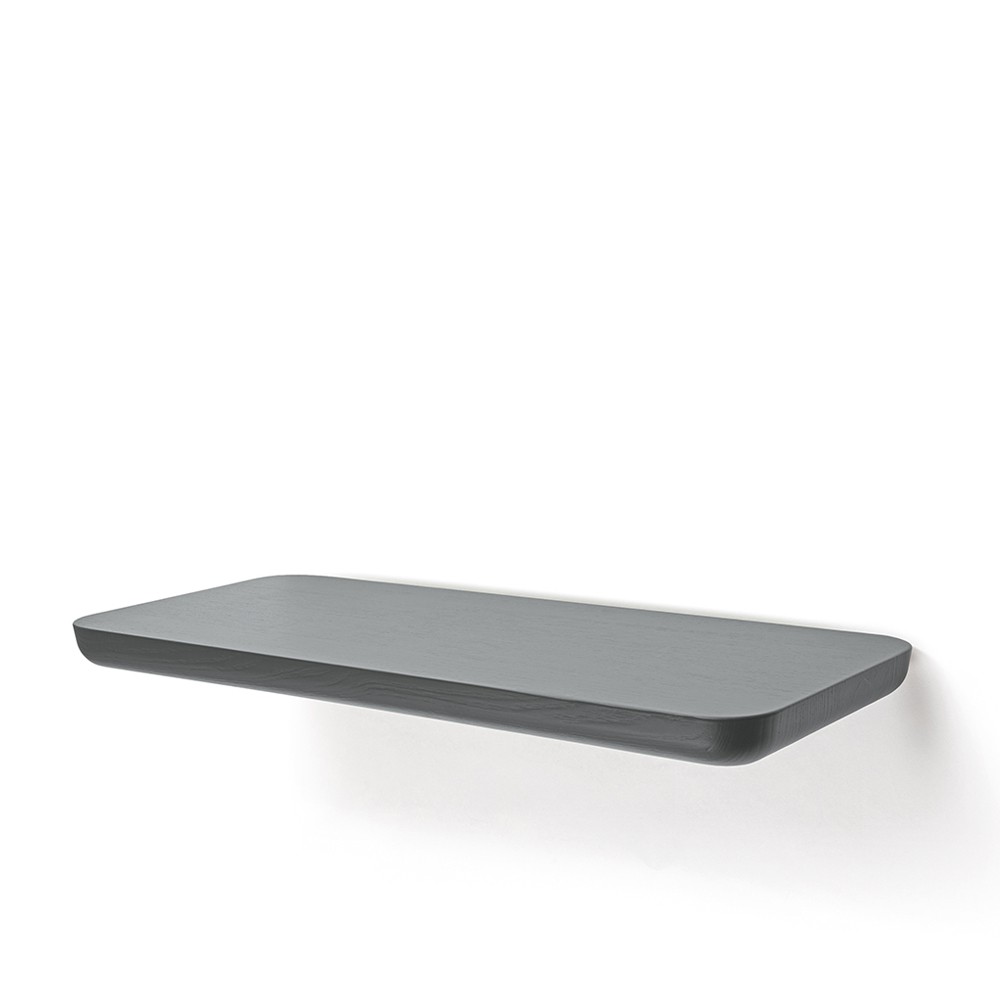 l’associazione di idee si deve alla forma della seduta con bordi curvati e al piano livellato, oltre che alle quattro gambe inclinate. Oggi la collezione si arricchisce di una mensola in due dimensioni, che riprende, anche a parete, il concept della lavorazione del legno.