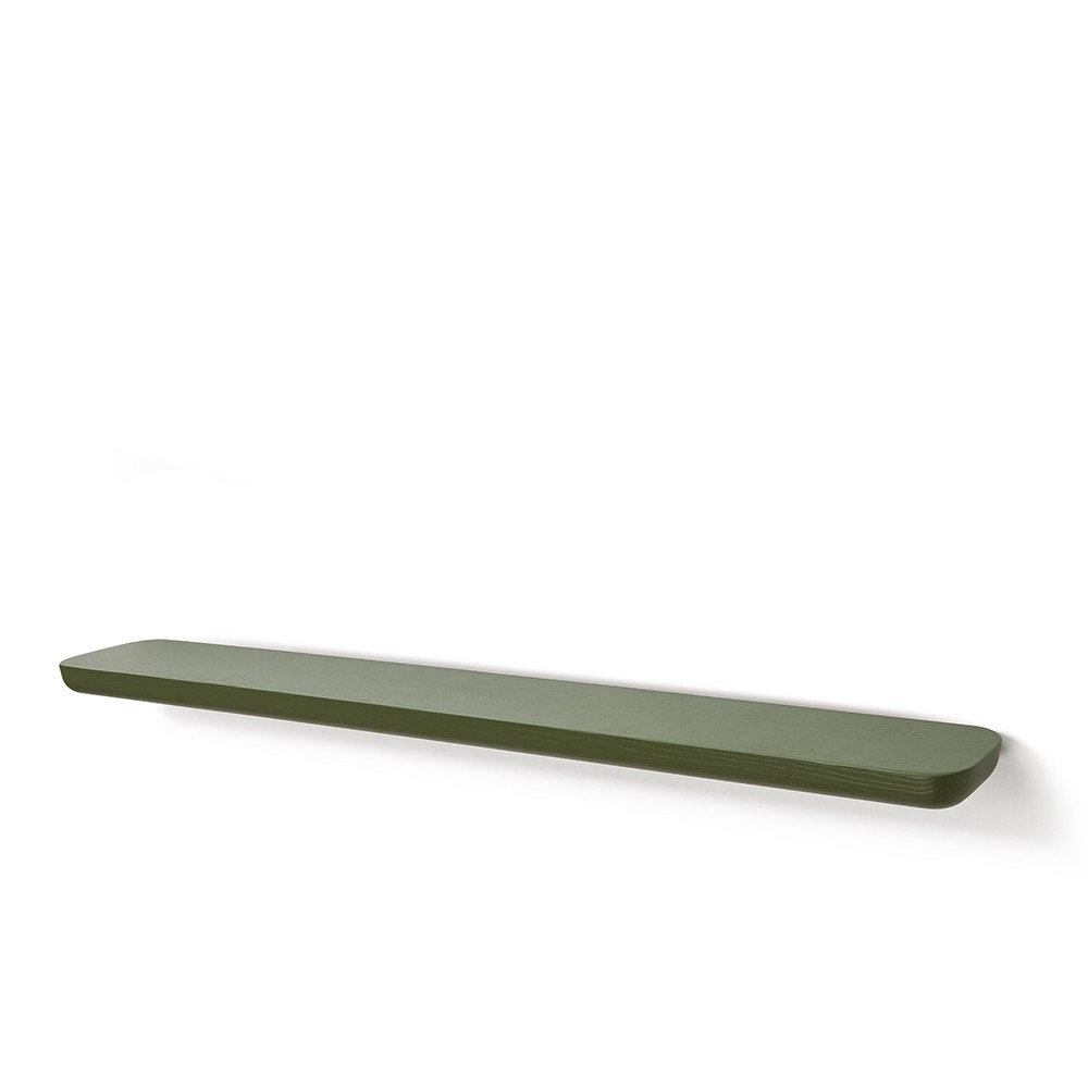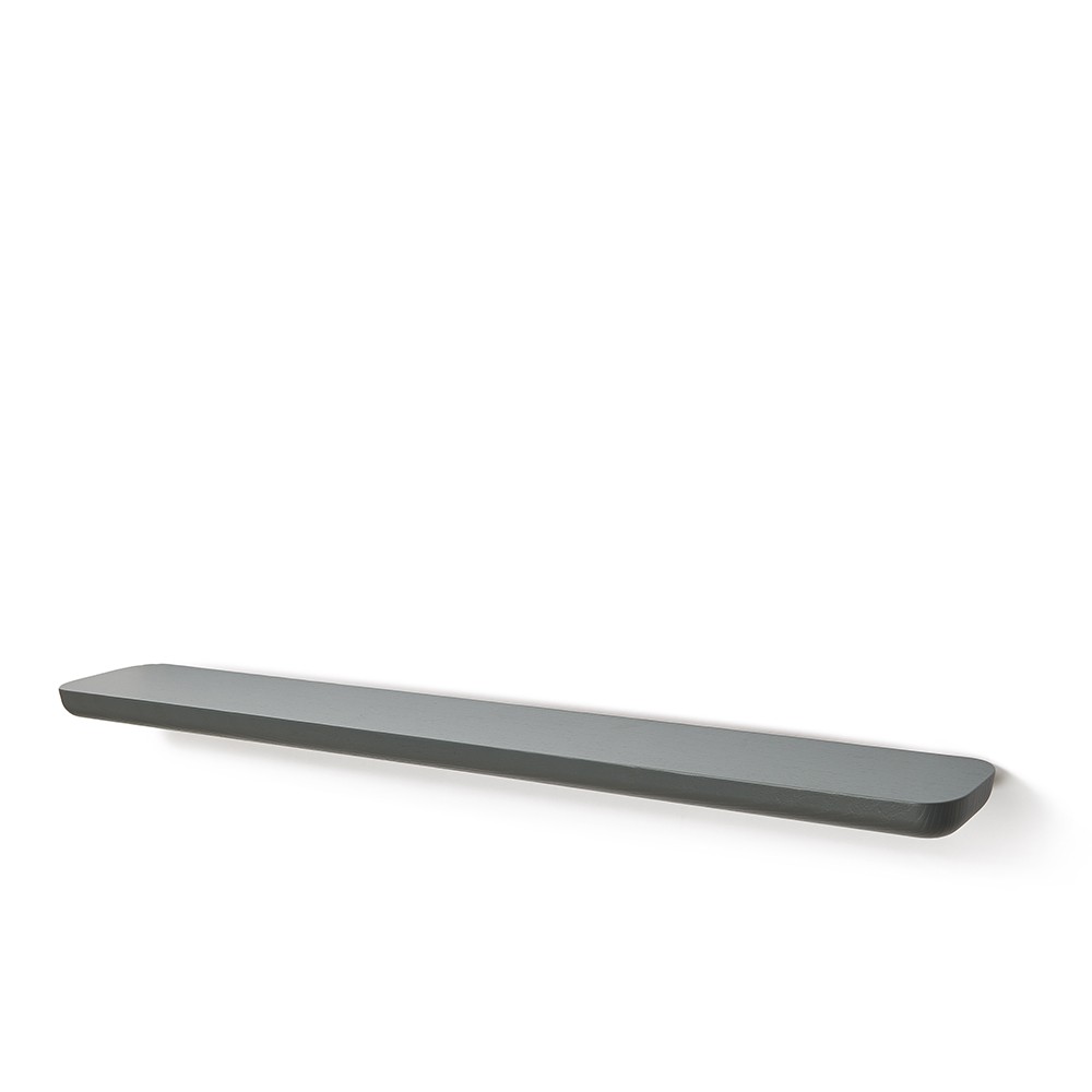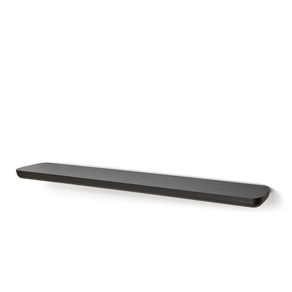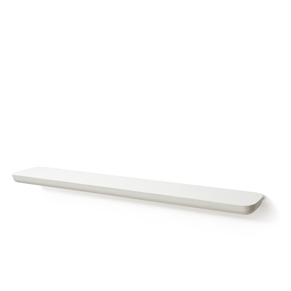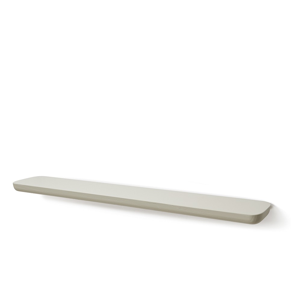 l’associazione di idee si deve alla forma della seduta con bordi curvati e al piano livellato, oltre che alle quattro gambe inclinate. Oggi la collezione si arricchisce di una mensola in due dimensioni, che riprende, anche a parete, il concept della lavorazione del legno.