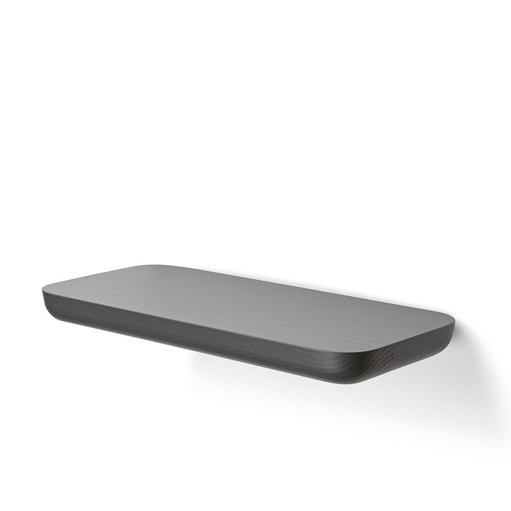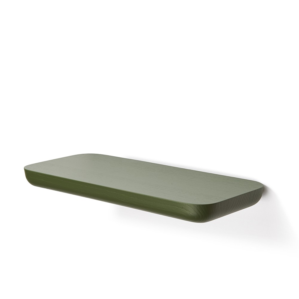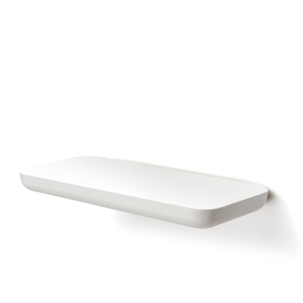 l’associazione di idee si deve alla forma della seduta con bordi curvati e al piano livellato, oltre che alle quattro gambe inclinate. Oggi la collezione si arricchisce di una mensola in due dimensioni, che riprende, anche a parete, il concept della lavorazione del legno.